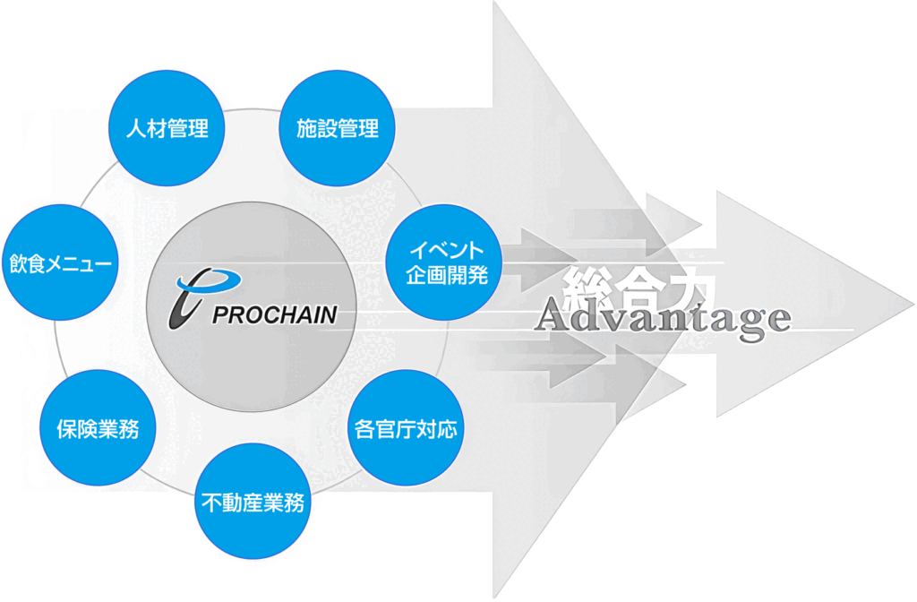 私たちプロシャンは、『接客』『企画』『フードメニュー開発』『清掃指導』『経費管理』『不動産』『広告宣伝』『デザイン』のプロフェッショナル集団です。